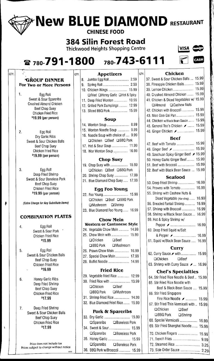 Blue Diamond Restaurant in Fort McMurray offers a compelling selection of Chinese dishes that balance familiar comfort with satisfying flavors. The menu shines with its pork and spareribs options, such as the Honey Garlic Boneless Pork and Dry Garlic Ribs, each priced fairly and packed with bold, savory notes. For noodle lovers, the chef’s specialties—like StirFried Shanghai Noodles and Singapore Fine Rice Noodles—stand out for their authentic textures and spices, delivering a hearty experience that's hard to find locally.